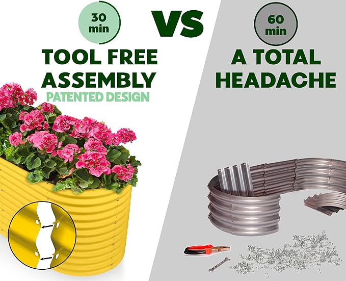 - EFFORTLESS ASSEMBLY, LIKE NO OTHER! Begin your planting journey by choosing our innovative patent-pending design, featuring the perfect combination of easy assembly and durability. Thanks to our unique tool-free design, assembly is a breeze and can be completed in just 30 minutes! Get started on your garden right away and enjoy fresh, healthy produce in no time.