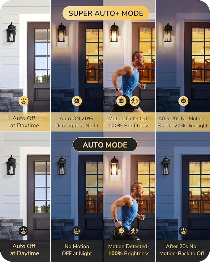 - [Upgrade 3 Lighting Modes] 3 lighting modes available, โ Auto+: 20%-50% brightness at night, 100% light once motion detected, 20-180s no motion back to 20%-50% dim light; โก Auto: off at daytime, auto on 100% light when motion detected, auto off after 20-180s no motion; โข PC: auto off at daytime, auto turn on outdoor wall lantern at night