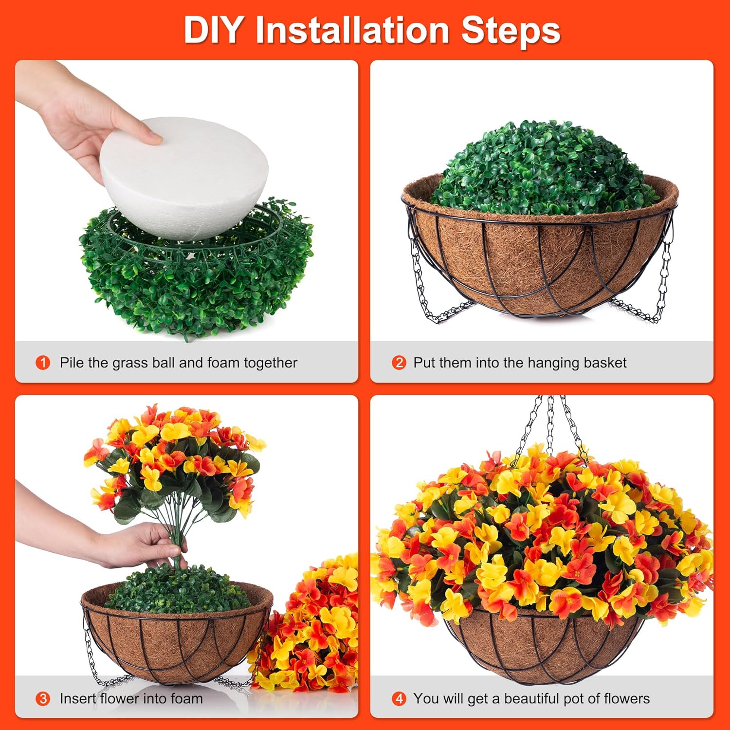 - Artificial hanging plant needs 5 minutes to assemble. Unleash your creativity with our DIY project. Design your own flower arrangements, using our hanging baskets as inspiration, Simply place the silk hydrangea branches to the basket and design the shape. Please refer to the pictures listed above if you need further instruction.