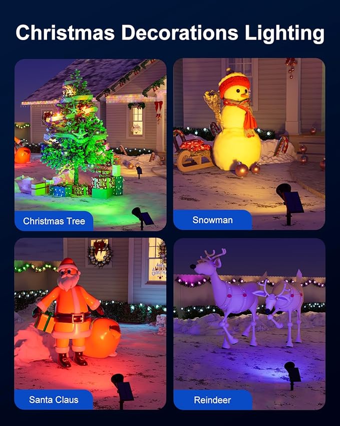 - Personalised Light Color for All Festivals: The color changing solar spot lights are not only suitable for Christmas, but also meet the needs of other festivals such as Halloween, Easter, Independence Day, etc. You can choose the appropriate light colours according to the characteristics of different festivals to create personalised scenes, making your home and yard show unique charm in every festival.