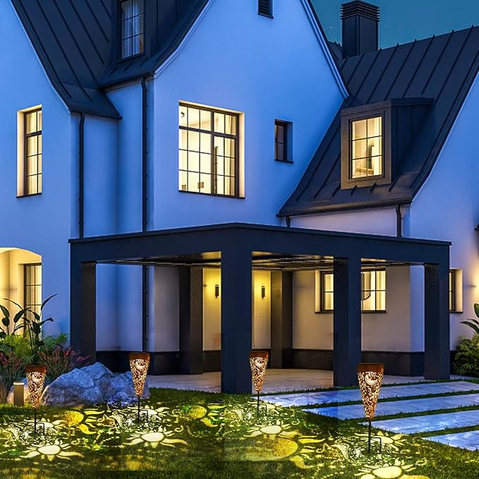 DIBIEECN 4 Pack Sun and Moon Solar Garden Pathway Lights Outdoor,Metal Garden Decorations Outdoor Lights with Patterns and Warm Light,Waterproof Landscape Lighting for Path Patio Backyard Yard