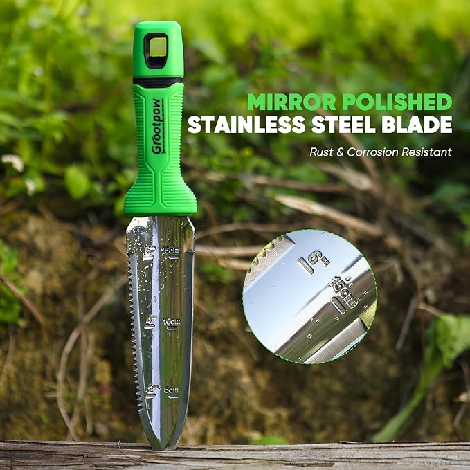 - 🌻 USER-FRIENDLY DESIGN: Easy-to-read measurement markings and graduations (in inches and millimeters) on the blade ensure you can plant and sow seeds at precisely the correct depth; Curved blade for easy digging; The gardening knife is a useful instrument for planting, moving plants or flowers, or digging out weeds