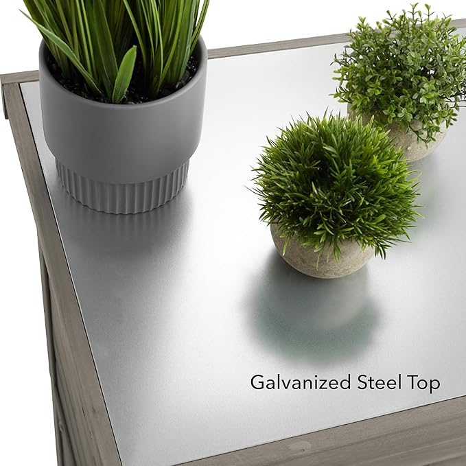 - Easy assembly and maintenance: Pre-drilled holes, included hardware and instruction manual, enable an easy set-up. The galvanized metal steel top requires a wipe down with a damp cloth to maintain cleanliness, ensuring the work surface remains sanitary and free from debris. With regular maintenance such as sealing or staining, the cabinet maintains both its structural integrity and aesthetic appeal over many years of use. Overall dimensions: 36.5” H x 17.75” D x 31.5” W.