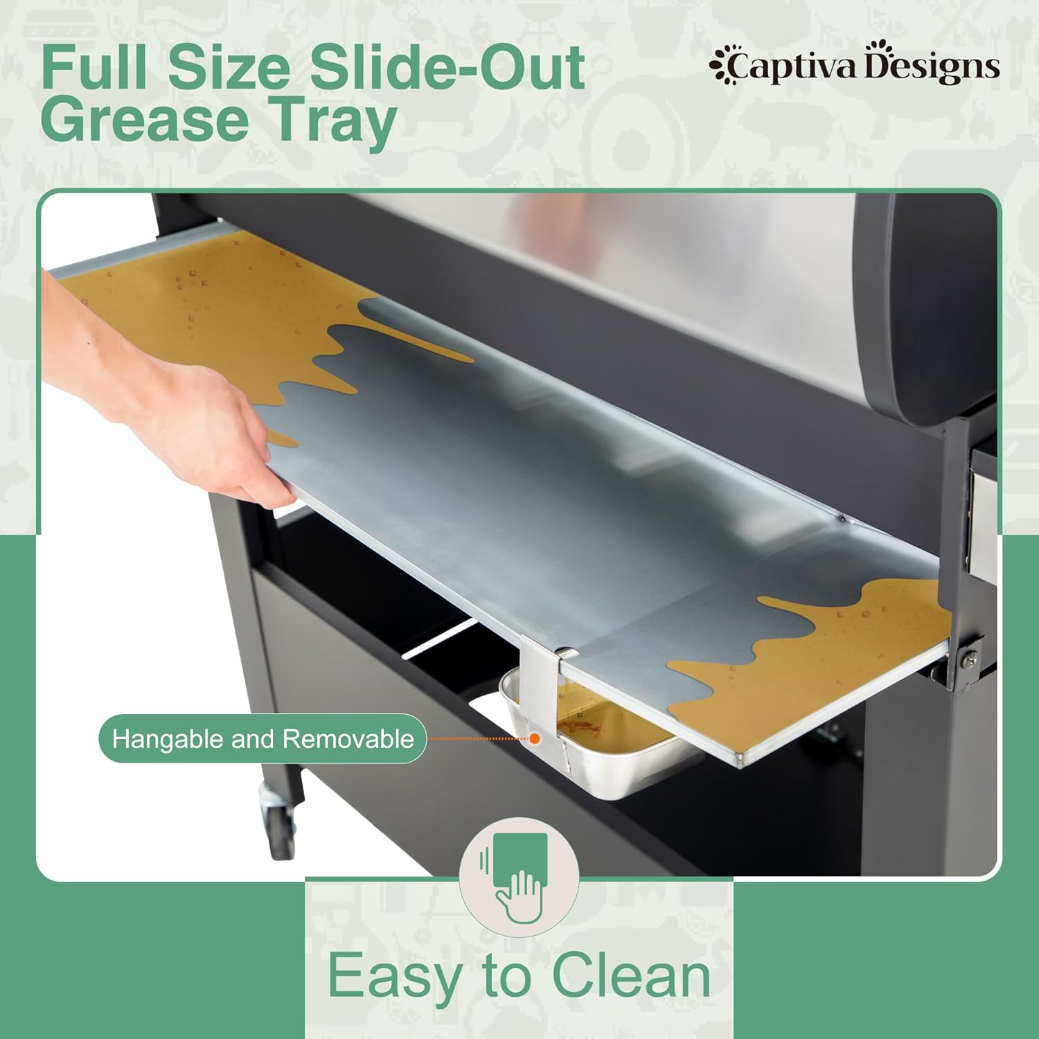 - 𝐄𝐚𝐬𝐲 𝐭𝐨 𝐂𝐥𝐞𝐚𝐧: Below the grill chamber body, there is a fullsized slideout grease tray, and it has been designed with a tilt so that the grease can flow directly into the hanging grease box below. The design of the slideout greasetray and the hanging grease box makes grilling cleaning much easier after BBQ time