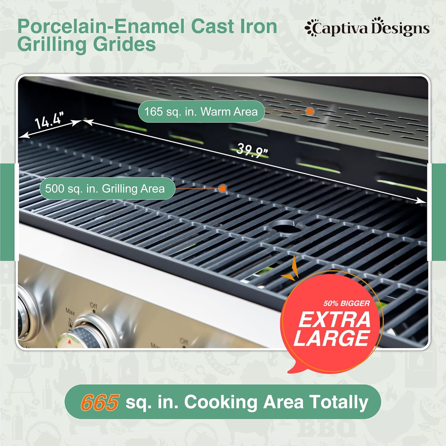 - 𝐏𝐨𝐫𝐜𝐞𝐥𝐚𝐢𝐧-𝐄𝐧𝐚𝐦𝐞𝐥𝐞𝐝 𝐂𝐚𝐬𝐭 𝐈𝐫𝐨𝐧 𝐆𝐫𝐢𝐥𝐥 𝐆𝐫𝐚𝐭𝐞𝐬: We upgraded main cooking area grates into porcelainenameled cast iron grates, which combines trodditonal cast iron and enamel grates advantages heavy duty, nonstick, rust resistant and crack resistant. They will bring the cooking area more even heat when worked with the 6 stainless steel burners and enameled flame tamers