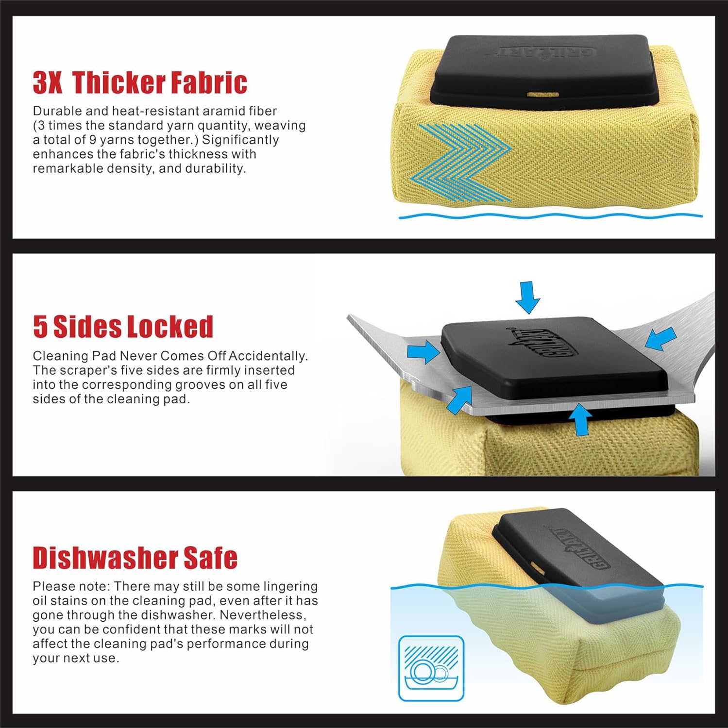 - Durable and Sturdy - The long stainless steel handle never bends or breaks, keeping you away from heat sources. Built-in scraper for removing cold build-up residue. Brush cleaning head is made of heat resistant foam, wrapped in heat resistant cloth and is reusable for safe use on hot grills (preheat grill to over 400 degrees Fahrenheit and then turn off all burners for your safety.