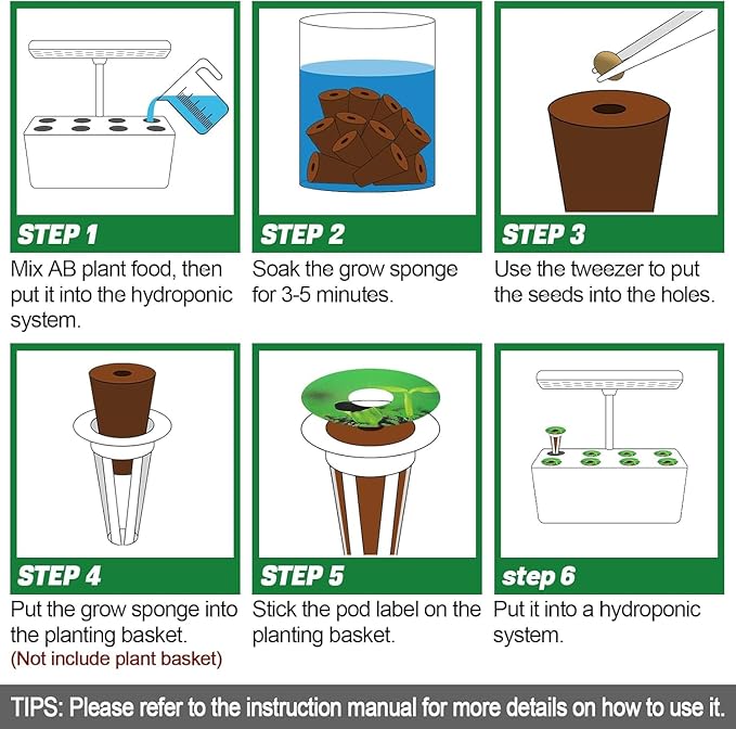 - Easy to Use: You simply mix AB plant food with water in the correct proportions and pour it into the hydroponic system, place the plants into the growing sponge(please soak the grow sponge for 3-5 minutes before use), then put the sponge into the grow basket, and finally place into the hydroponic system. [Please refer to the instruction manual for more usage methods.]