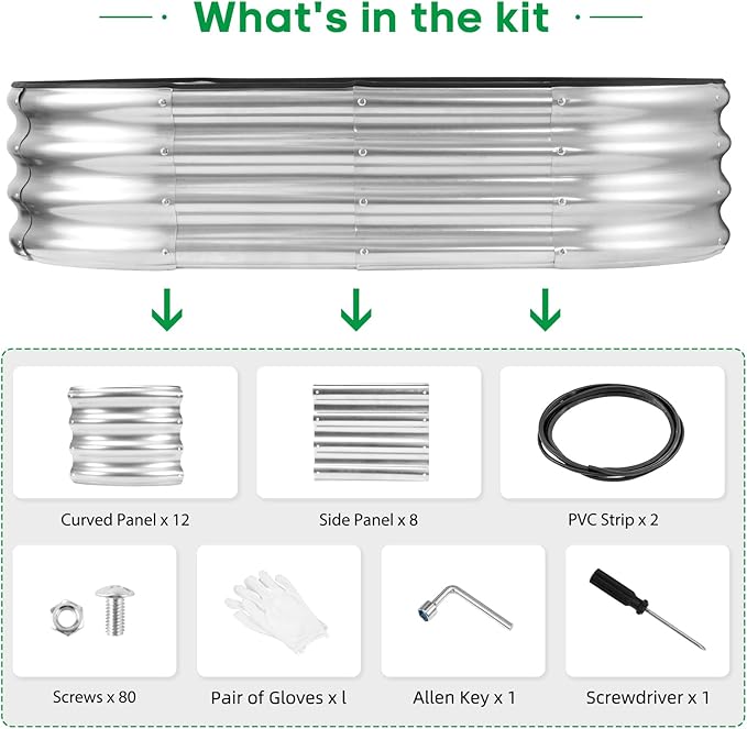 - What You Get: we have included Galvanized raised garden bed kit with detailed assembly instructions, rubber edge strips, safety gloves , wrench tools and with galvanized nuts and bolts in the box .These essential tools elevate your overall planting and gardening adventure.