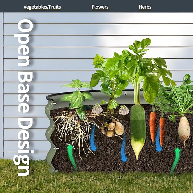 - Open Bottom Design: Open base provides good drainage and effectively protects the roots from rotting due to excessive watering. Large capacity metal garden bed allow you to enjoy fresh and healthy vegetables and fruits, flowers in your garden, balcony.