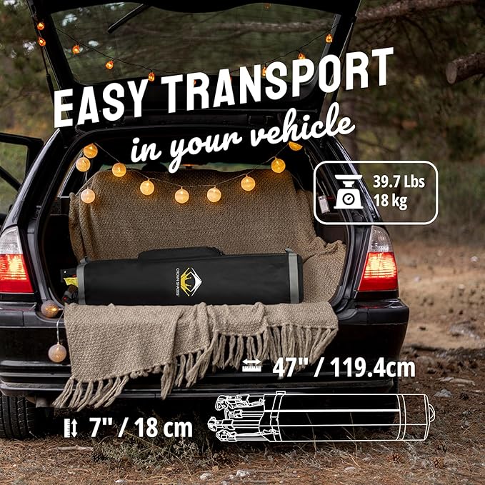 - SPACIOUS AND COMPACT - With a 10' x 10' canopy footprint, this tent provides 100 square feet of shade, accommodating up to 10 people comfortably. The interior height exceeds 9 feet, and the maximum clearance under the valance is over 6 feet. When packed, the dimensions are 45” x 8.5” x 8.5”, fitting perfectly in your vehicle’s trunk. The headroom is enhanced by the absence of overhead crossbars, offering more spaciousness compared to traditional designs, making it great for parties and events