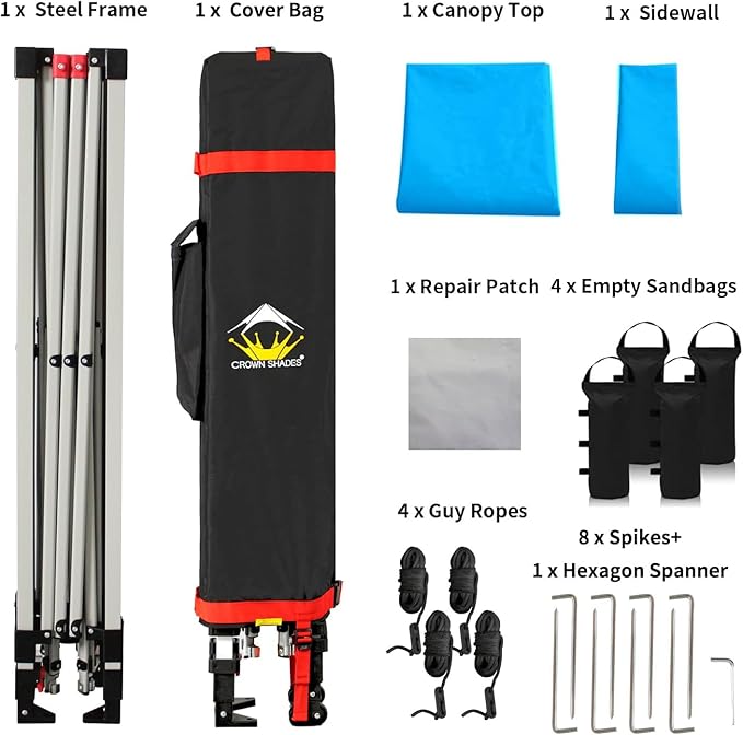 - STO’ N GO SYSTEM - Our lift-free system makes collapsing, storing, and transporting the 8x8 tent a breeze. The 8x8 tents can be stored with the fabric attached, with a specialized pocket for 4 sandbags, 8 stakes, and 4 guy ropes. Integrated wheels in the feet allow easy movement even when the instant shelter tent is set up, by simply lifting the side without wheels. This feature is especially useful for quick setup and takedown at locations like the patio or sports events