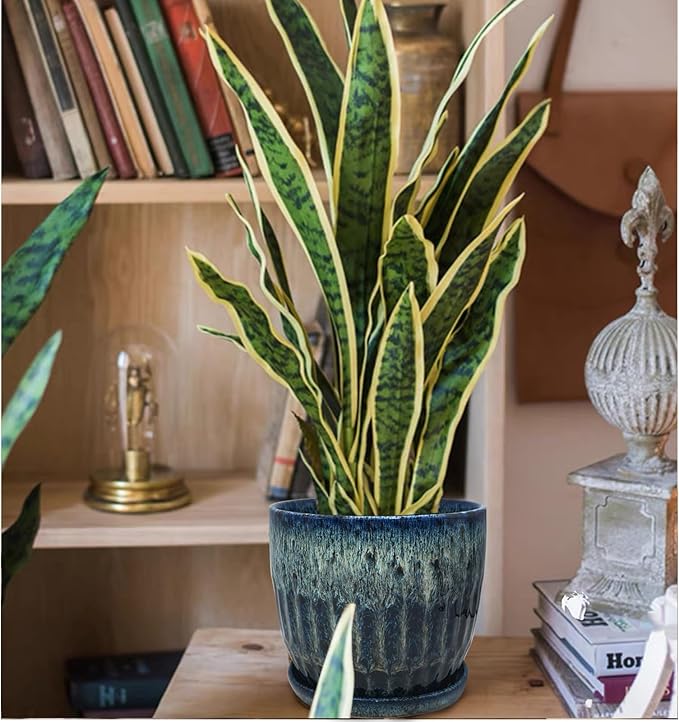 Ceramic Pots for Plants, 6in Ceramic Planters for Indoor Plants, Flower Pots with Drainage and Saucer, Reactive Glaze Blue