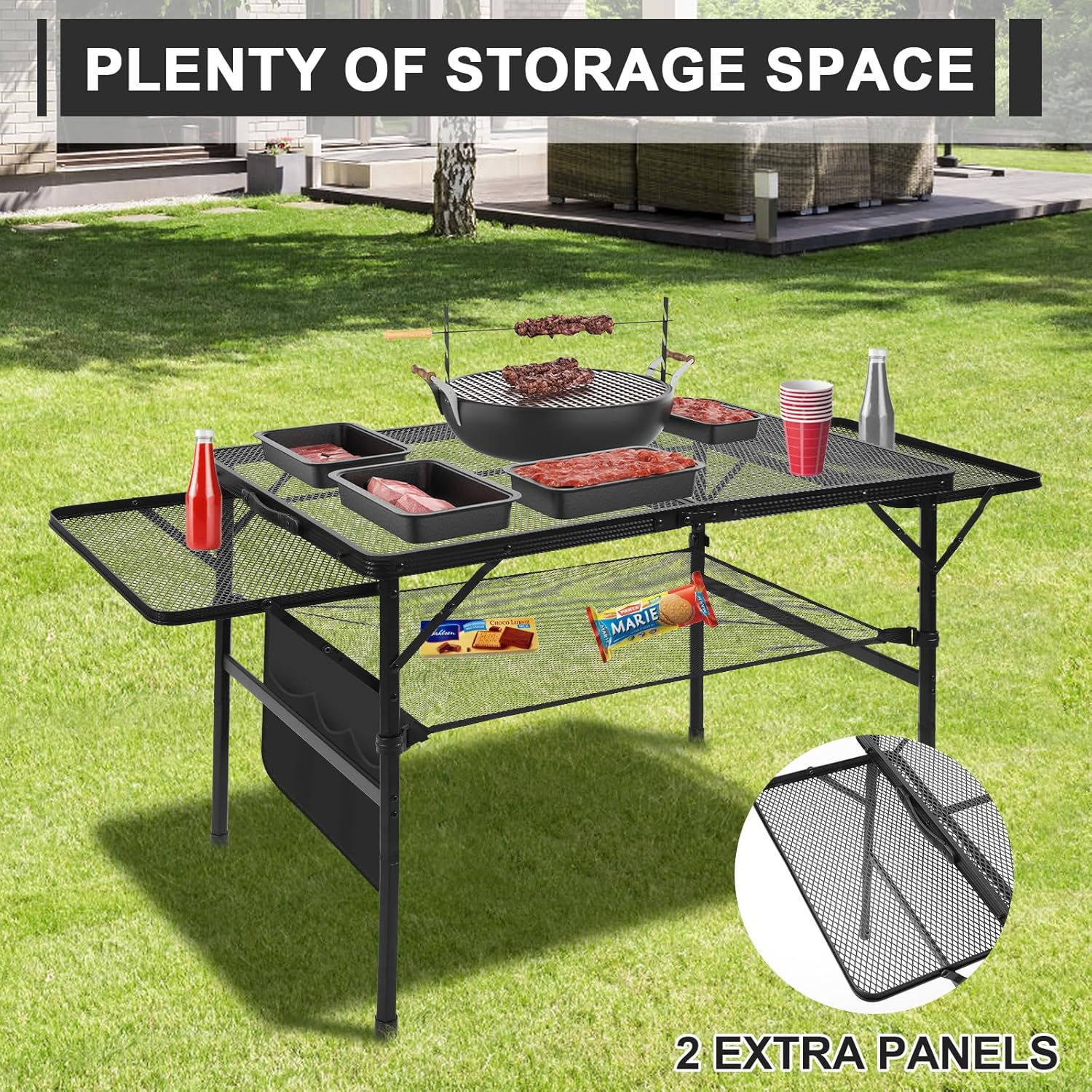 - [Waterproof and Anti-high Temperature]---- With a special coating mesh desktop, this grill table can effectively avoid water accumulation and rust. In addition,it’s made of high-temperature resistant material, you can set up a small barbecues to enjoy a beautiful time.