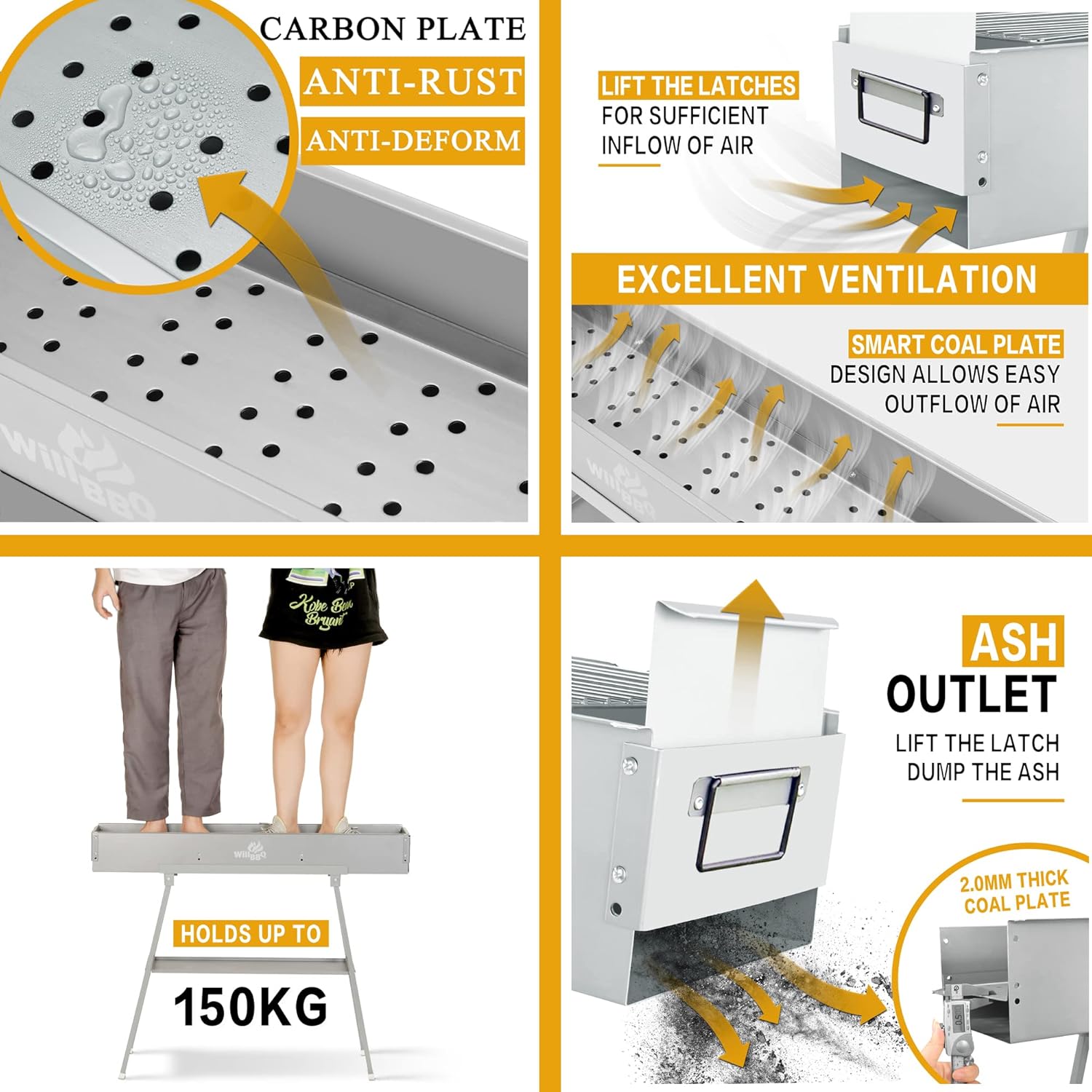 - Excellent Ventilation Design:Air vents on both ends of the charcoal grill allow for proper temperature adjustment and control.thus, heat can be evenly distributed throughout the charcoal grills, and the charcoal inside is fully burned,enables you to cook meat confidently.