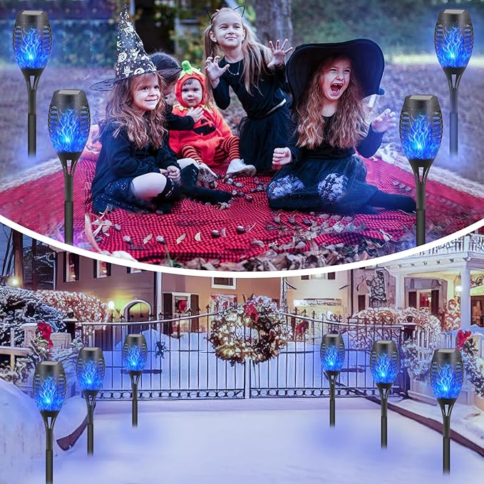 - Flickering Flame Torch Lights: FAISHILAN small blue solar outdoor torch lights cast a lovely warm glow resembling flickering flames, providing a safe alternative to real flames. These solar outdoor lights feature a soft, flame-like flicker, making them ideal for decorating patios, gardens, yards, porches, pools, as well as for parties, camping, barbecues, and weddings