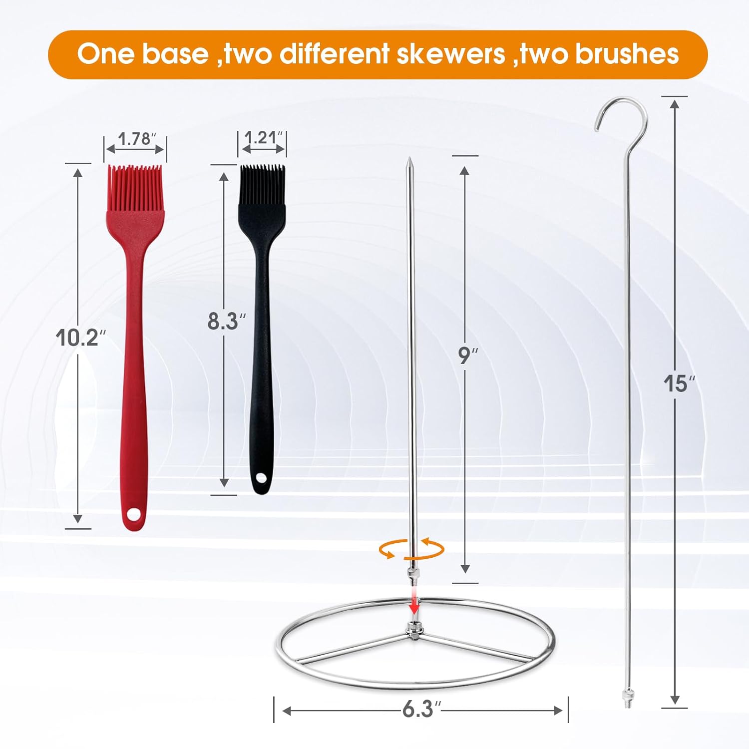 - Dimensions: Base diameter 6.3 inches, hook length 15 inches, spike length 9 inches, maximum load capacity approximately 15 pounds. Suitable for most smokers, ceramic grills, ovens, charcoal gas grills, and any deep fryers.
