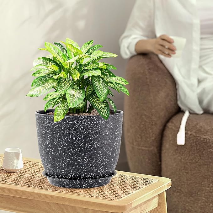 9/8/7.5 inch Plant Pots, Set of 3 Modern Decorative Plastic Planters with Drainage Holes and Saucer for Garden House Plants, Flower Pots for Indoor Outdoor Plants, Speckled Black