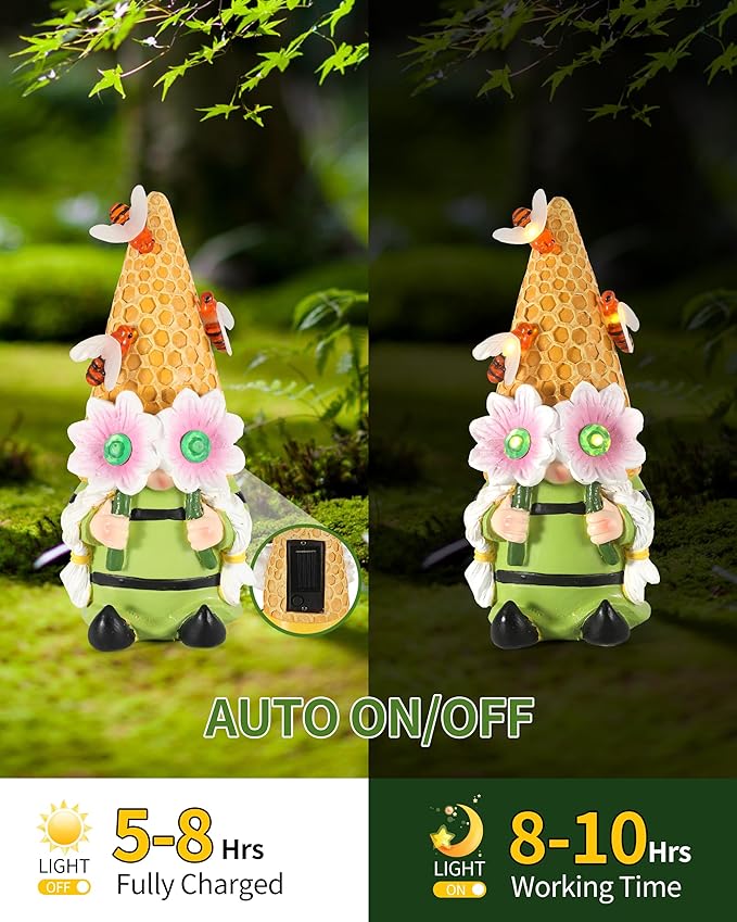 - 💡 LED Lighting: As dusk falls, watch the gnome’s flower eyes and bee come alive! The integrated LED lamp emits a soft glow, highlighting its intricate features.