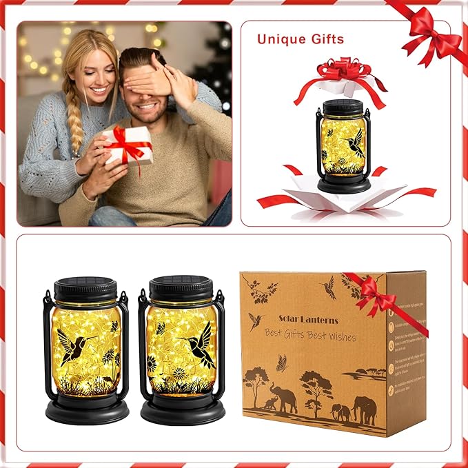 2 Pack Hummingbird Solar Outdoor Lanterns, Birthday Mothers Day Gifts for Women Mom Grandma, Vintage Glass Mason Jar Solar Fairy Lights, Waterproof Garden Lights for Patio Yard Lawn Tree Party Decor