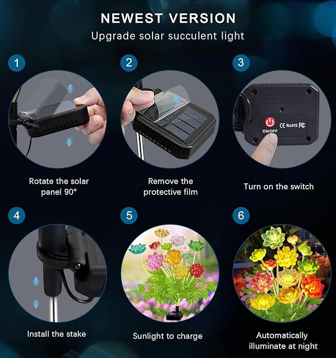 • Upgraded Succulent Flowers Solar Lights-Compared with ordinary ground lights, each solar garden light has 12 succulent plant lights and green lifelike leaves. Their designs are more elaborate and realistic than other succulent decorations. We also upgraded the solar panels to a larger size and a higher conversion rate than other solar panels