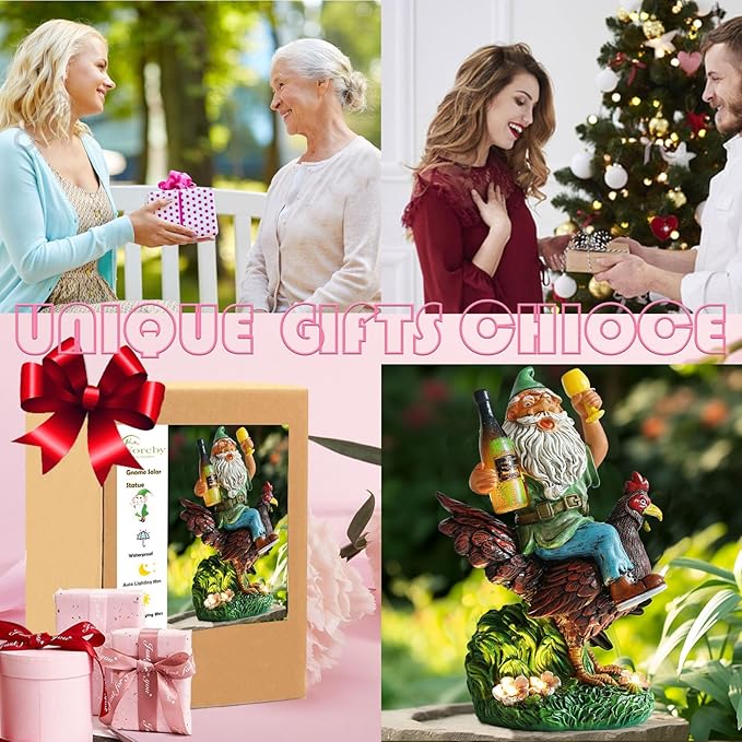 - 🌟【Funny Outdoor Decortaion Design 】Funny gnome sculpture with a solar wine on hand,riding a rooster in the garden , It has a funny expression and a tilted head, which making it a beautiful and eye-catching addition to your garden or home.