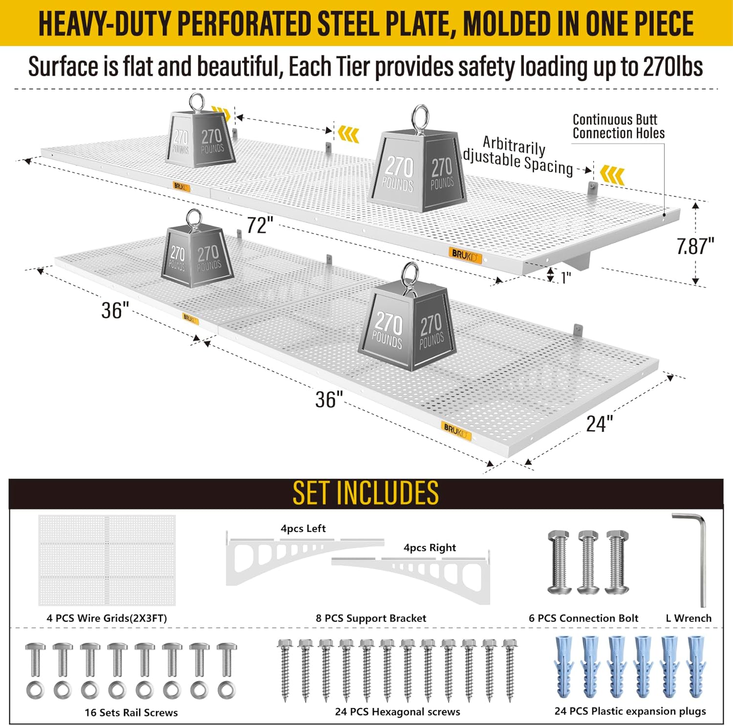 - SUPERIOR DESIGN: Wall shelf garage storage rack panel is made of whole piece of perforated steel plate bending and welding, the surface of matte high temperature powder baking paint, flat and smooth; the panel adopts slide rail design, can be adjusted by parallel left and right sliding at will; bracket can be freely installed in 33” range of the spacing of the wood wall keel, without affecting the precision connection with the panel, eliminating the worry of being unable to docking due to the mismatch of spacing points of load-bearing wood wall keel or inaccuracy of the installation of the bracket. It saves time and labor