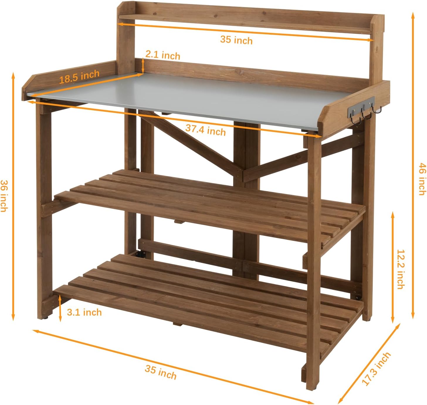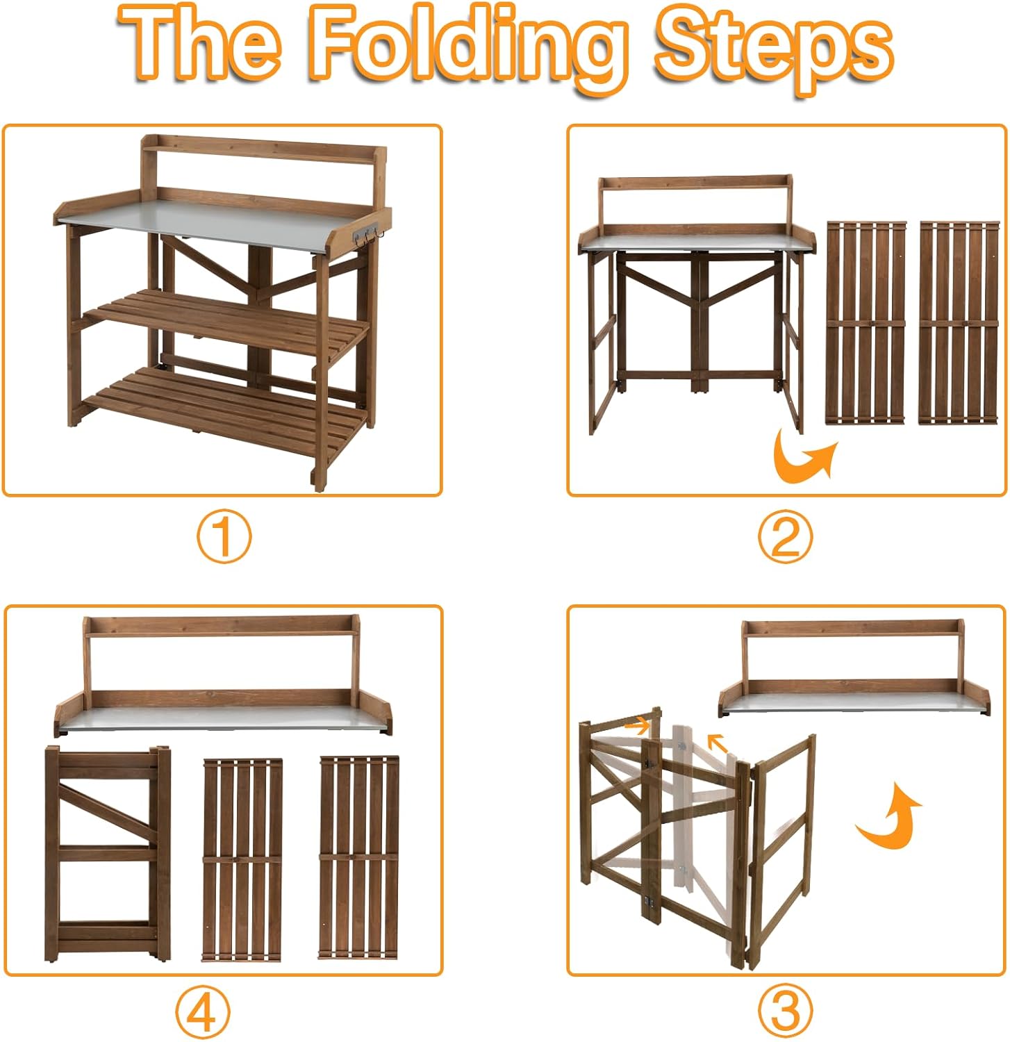 Folding Potting Bench Table,Outdoor Potting Bench Garden Wooden Potting Table,Fir Wood Workstation Planting Table with Galvanized Tabletop,2 Tier Storage Shelves,Top Shelf(Brown)