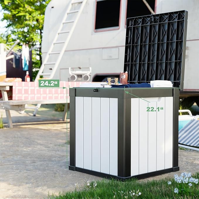 - 𝐂𝐨𝐦𝐩𝐚𝐜𝐭 𝐲𝐞𝐭 𝐏𝐨𝐰𝐞𝐫𝐟𝐮𝐥 - With product dimensions of 22.1"L x 22.1"W x 24.2"H , Although this outdoor storage box has a storage capacity of only 28 gallons, but it can hold a variety of additional items in your backyard, such as patio cushions, pillows, gardening tools, and hoses. This outdoor storage box is the best choice for storing small items.Applicable age: 0 years and above