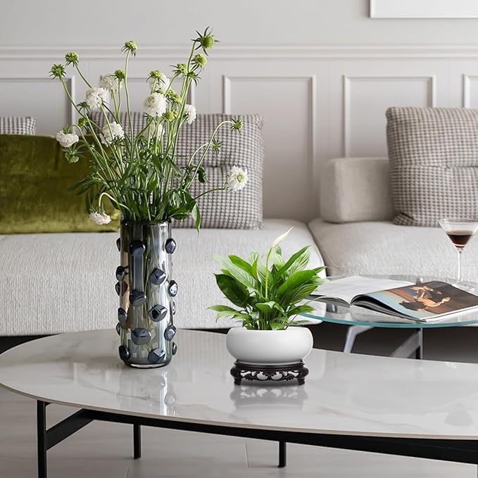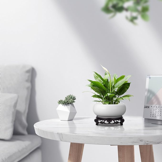Ceramic Chinese Pot with Base White Water Lily Bowl 6Inch Porcelain Lotus Pot Jardiniere Planter Oriental Fish Bowl Bonsai Vase