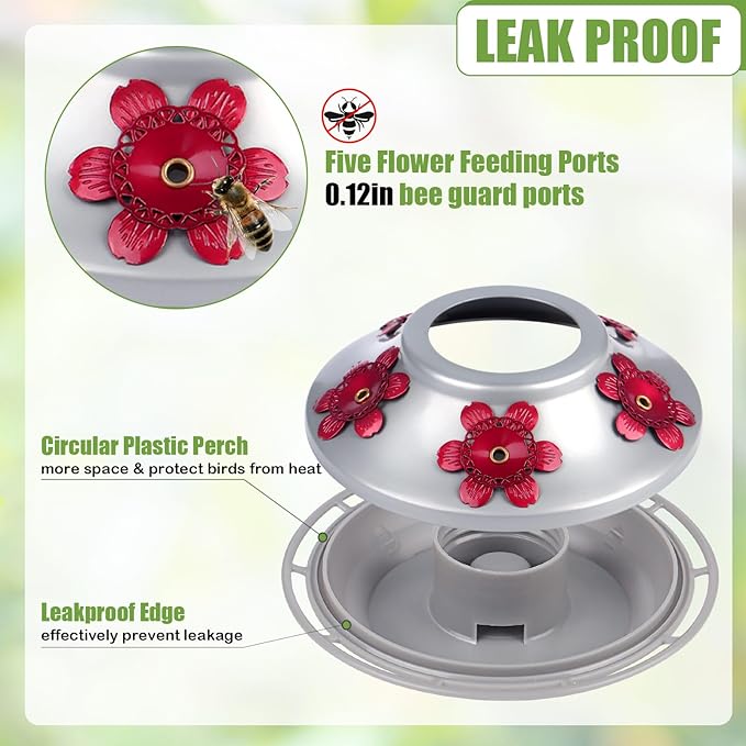 - Ample Feeding Space: Five flower shape feeding prorts are perches arranged in a circular manner for several humming birds dine and rest at the same time. Upgraded glass hummingbird feeder with 22 oz nectar capacity have perfect size to keep nectar fresh