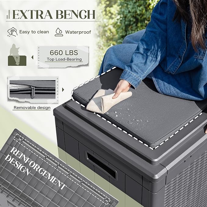 - EXTRA CUSHION:Besides helping you to organize your space, the deck box is equipped with a removable thick cushion, you can also use it as a stool to ensure your safety when opening and closing the box.