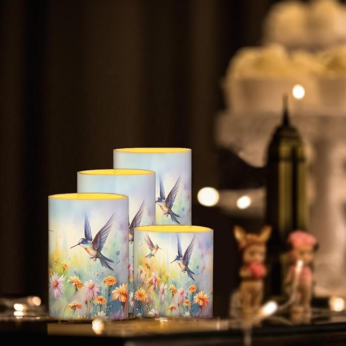 Flameless Candles Battery Powered LED Candles with Remote Timer Color Changing Control Long Lasting for Indoor Outdoor Home Decoration Set of 4, Hummingbird Daisy Purple