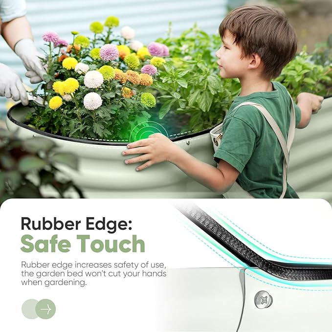 - 【Rubber Strip Edging】The edges of the raised garden bed kit feature a rolled design and are equipped with rubber strips to eliminate sharp edges. This ensures your hands won’t get cut during assembly and planting, allowing you to safely enjoy the pleasures of gardening.