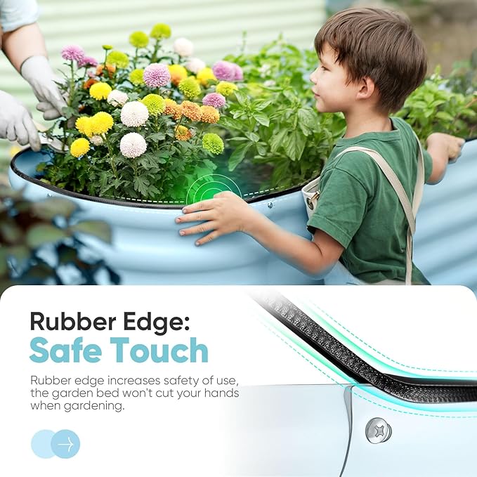 - 【Rubber Strip Edging】The edges of the raised garden bed kit feature a rolled design and are equipped with rubber strips to eliminate sharp edges. This ensures your hands won’t get cut during assembly and planting, allowing you to safely enjoy the pleasures of gardening.