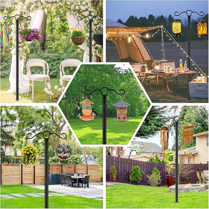 - [DOUBLE ARM DESIGN] This uniquely designed pole features a double arm design at the top of the pole, the arm-like sections provide you with a combination of elegance and functionality. The double arm design not only provides more hanging and display space, but also adds a distinctive look to your patio or garden. You can hang a variety of items such as flower baskets, bird feeders, lanterns, and more on each arm section to create a unique and charming landscape. Made from high quality materials, this stand is durable and suitable for a variety of outdoor environments.