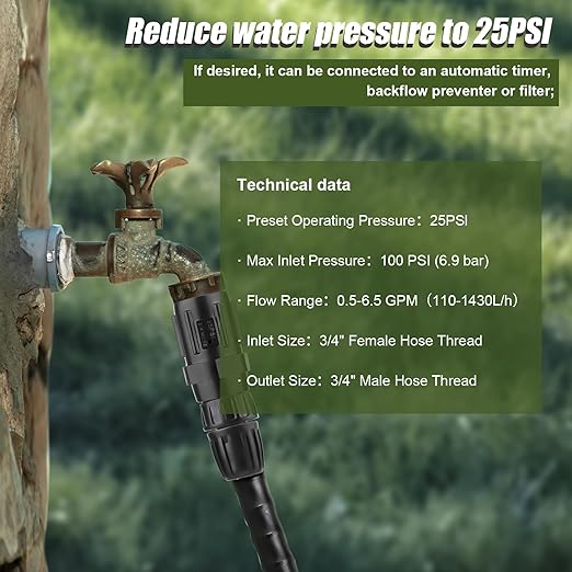 - 25 PSI Pressure Regulators: The 25 psi pressure regulator is designed to regulate and reduce water pressure, ensuring optimal performance for your drip irrigation system. Suitable for standard 3/4" outdoor faucets, water hoses, irrigation systems, etc.