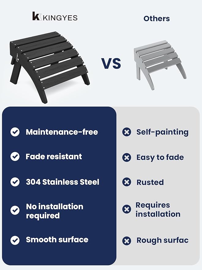 - [Low Maintenance]: Enjoy the hassle-free ownership of the KINGYES Adirondack Foot Rest. Its HDPE material requires no painting, staining, or waterproofing, making it the ultimate low-maintenance outdoor accessory.