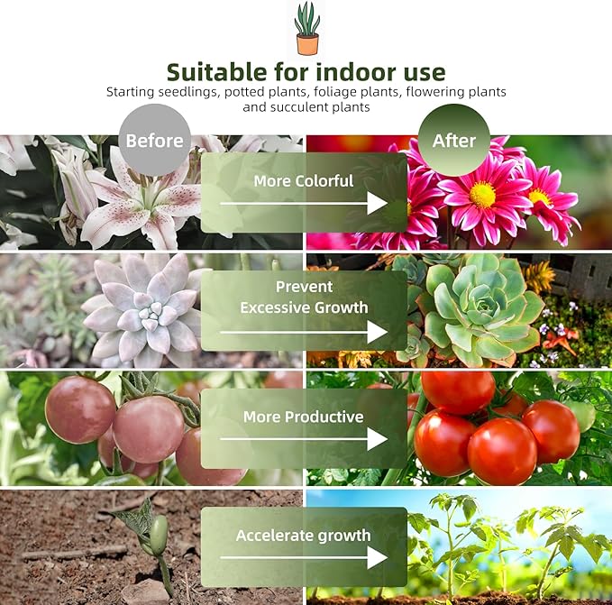 - 【Auto Turn On/Off Timer Everyday】: This plant growth light offers three cycle timing settings. It can remain on for 9, 12, or 15 hours, and then turn off for 15, 12, or 9 hours, respectively. Furthermore, it will automatically turn on and off at the same time every day.. This light provides a convenient way to ensure your plants receive proper care, even when you are away at work or on vacation.