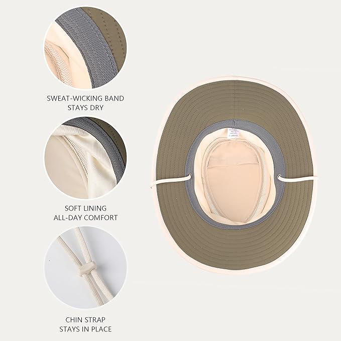 - Wide-Brim Safari Sun Hat – Classic boonie-style bucket hat offering full-coverage sun protection for fishing, hiking, running, camping and travel.