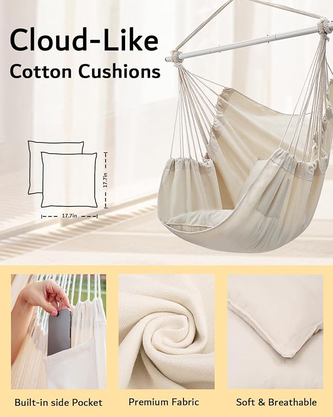 ADVOKAIR Hammock Chair Swing (500 lbs Max-2 Cushions) - Hanging Hammock Chair Rope Swing Indoor for Bedroom, Outdoor, Patio, Bedroom, Porch, Deck - Sturdy Steel Bar with Anti-Slip Safety Rings