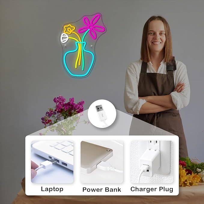- Premium Craftsmanship:Crafted with precision and care, our cute flower light up neon sign exemplifies superior craftsmanship and attention to detail. Each component is expertly crafted from high-quality materials, ensuring durability and longevity. From the delicate petals of the flowers to the graceful curves of the vase, every aspect of the design reflects the highest standards of quality and artistry.