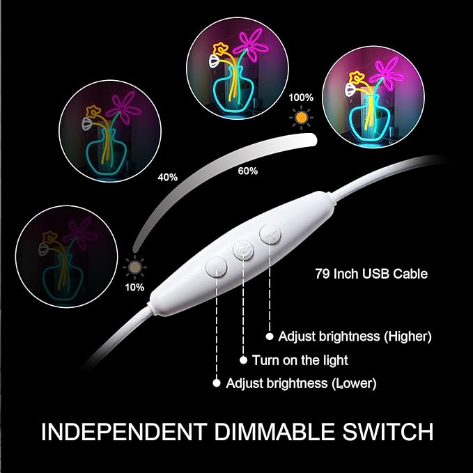 Flower Vase Neon Sign,Dimmable Neon Lights,Neon Flowers Sign for Wall Decor,Anime Flower Shape USB Connectivity Light Up Neon for Kids Room Girls Room Bar Birthday Party