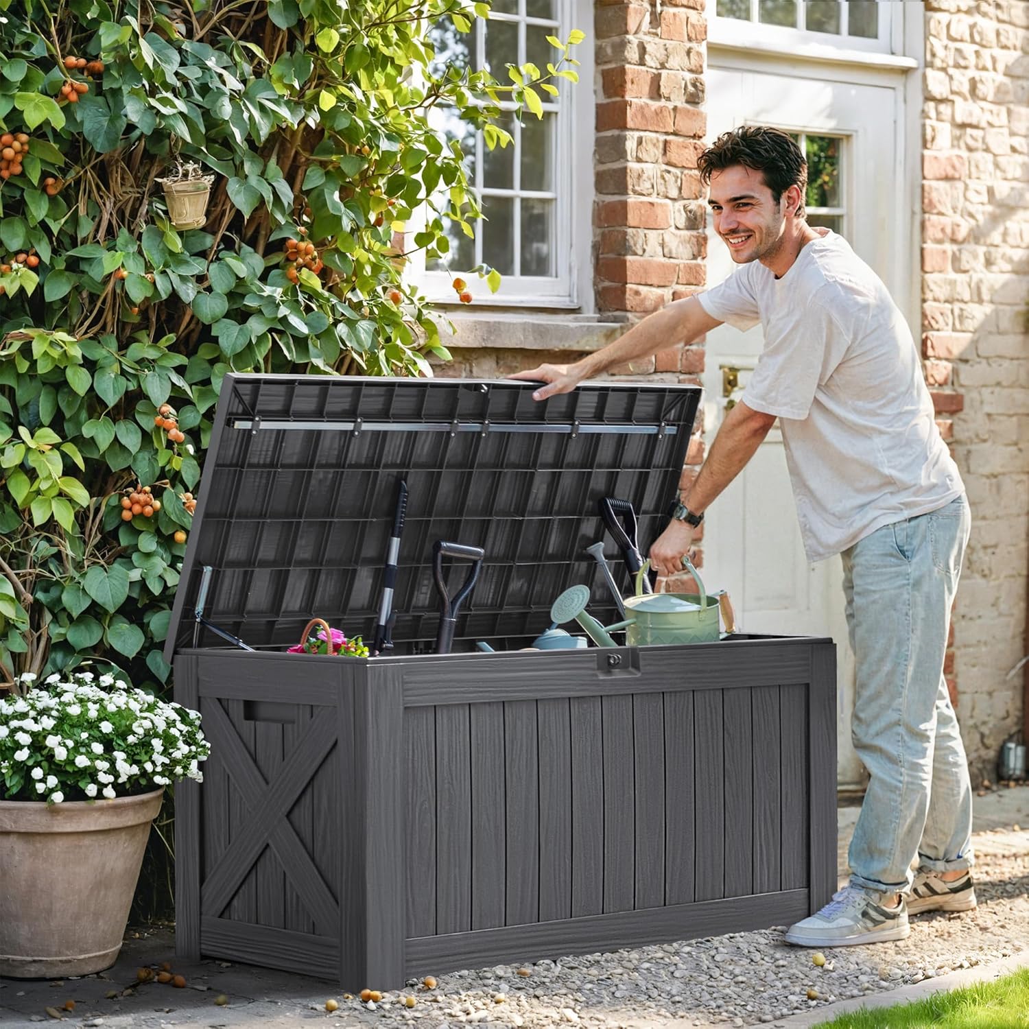 - Large Storage Capacity: The storage box is in 52.3”(L) x 24.2”(W) x 25.4”(H), and it has 120 gallons of storage space, which can perfectly place your garden tools, pool gear and etc, make sure your space looks clean and tidy.