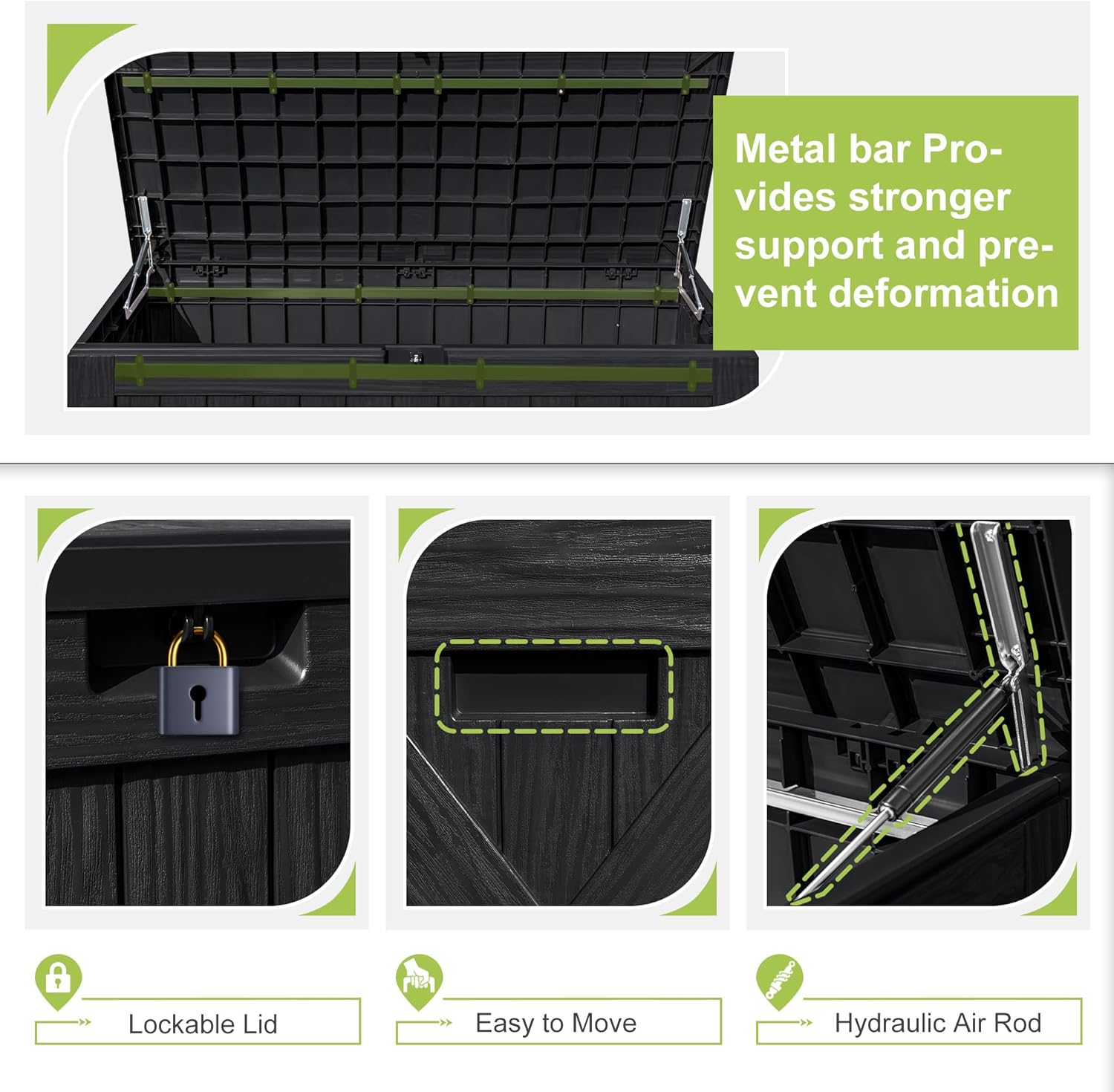 - Multi-functional Box: The 120 gallon storage box can not only help you organize your patio or lawn. It can also be used as a table or bench when you need it, and the lid is equipped with a support bar inside, which can greatly enhance the stability and weight-bearing capacity of the storage box.