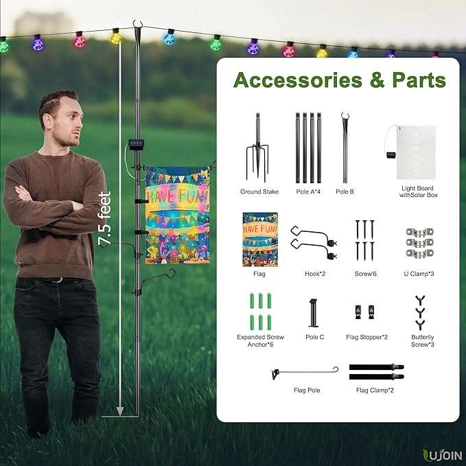 3-in-1 String Light Pole for Outside (2 Pack), Each Pack Includes 2 Hooks, 1 Solar LED Light Board & 1 Party Flag, Heavy Duty Stand for Deck, Patio, Backyard, Wedding