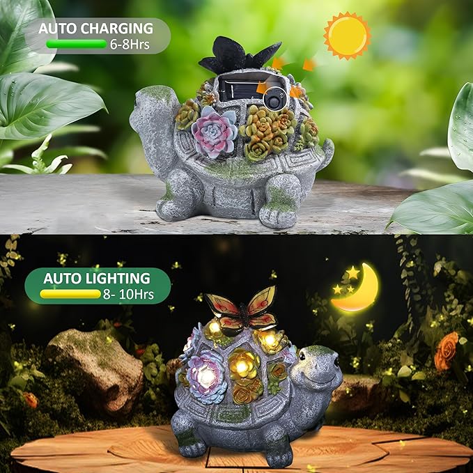 - 【Easy to Install & Maintain】No wiring or complicated installation is required. Simply turn on the garden turtle statue and place it in a sunny spot in your garden. The turtle figurine light will auto-charge during the day and automatically light up at night. It measures 9" L x 6.49" W x 6.85" H