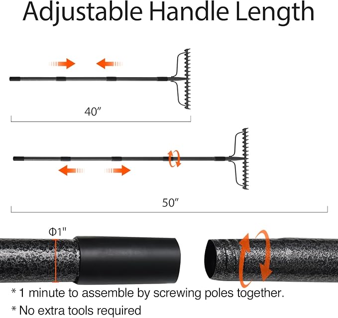- 1 minute to assemble hand rake by just screwing poles together with all screws provided.