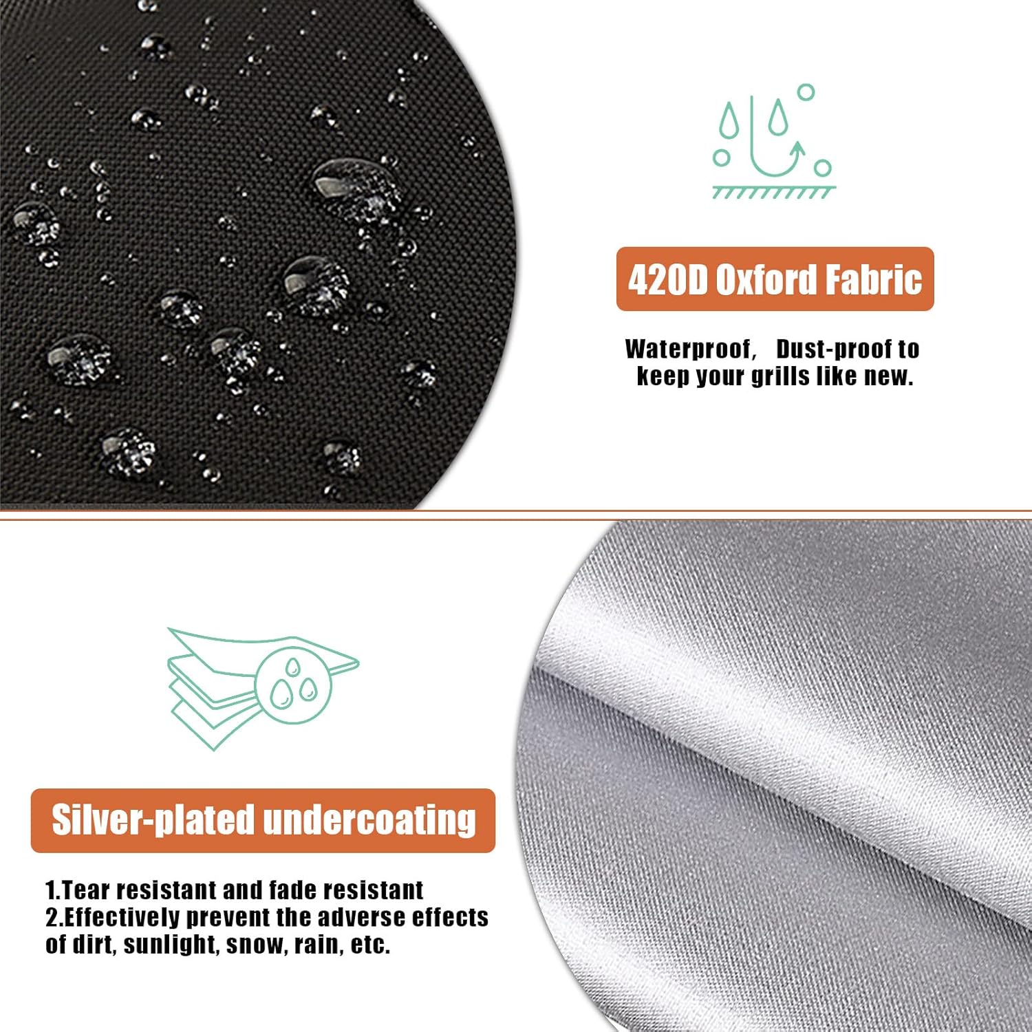 - 420D Oxford Fabric: Portable charcoal grill cover is made of 420D high-quality and high-density oxford fabric, with PU silver-plated undercoating and double stitches sewing. Which is waterproof, tear resistant and fade resistant.