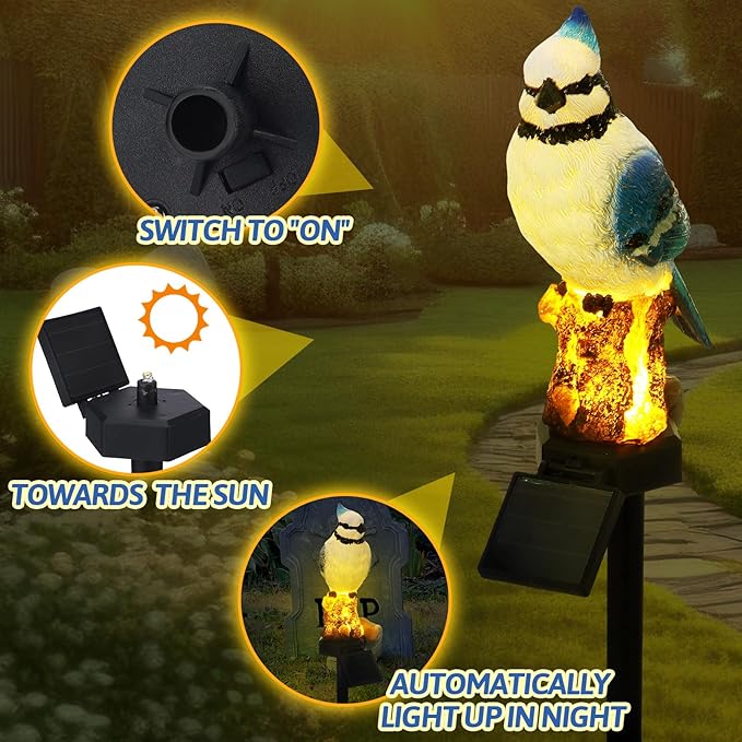 - Easy to Install: these blue bird solar lights are incredibly easy to install; Extra wiring or external electricity supply is not required, which will make them safe and convenient to set up; You just need to plug them in the ground where they can fully absorb the sun's energy, such as balconies, courtyards, driveways, and even flower beds
