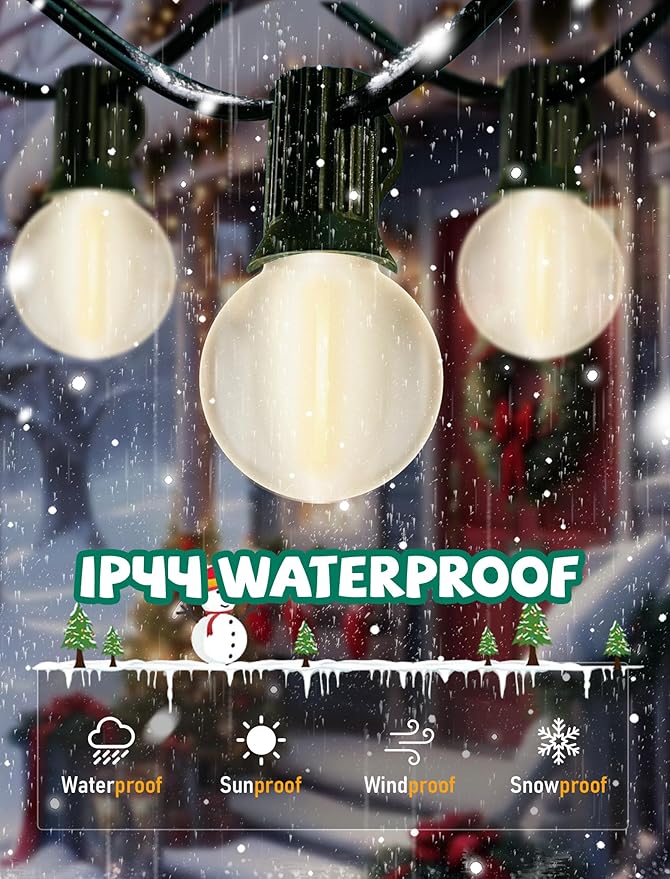 - Versatile G40 Christmas Lights: Illuminate your space with the G40 LED frosted white outdoor string lights, compatible with any E12 socket. This 25ft set includes 25 frosted LED bulbs and 2 spares, creating a soft, inviting glow for both indoor and outdoor settings, all mounted on a stylish green string.